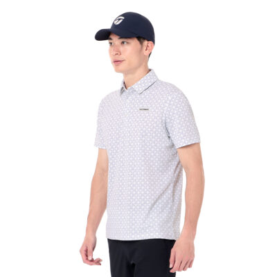 Một chiếc áo polo cộc tay với thiết kế graphic của logo TaylorMade cổ điển. Cổ áo có thiết kế cổ dây.