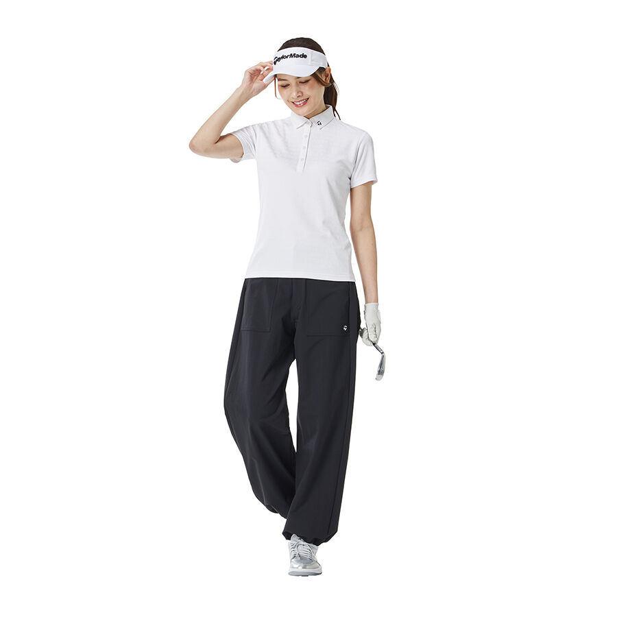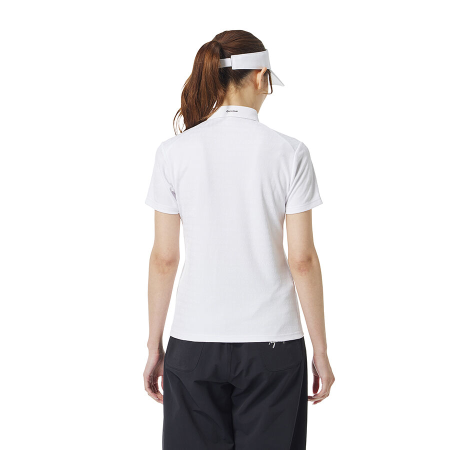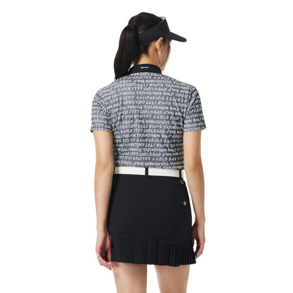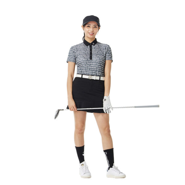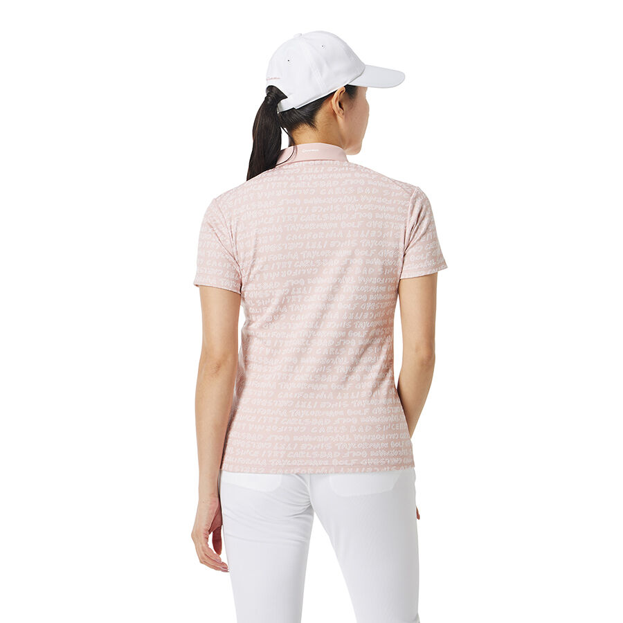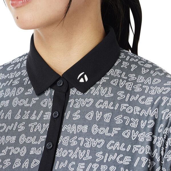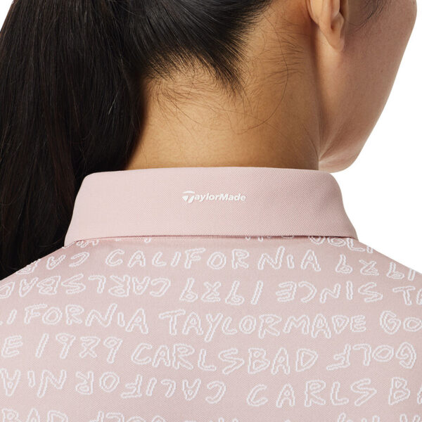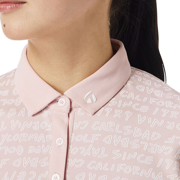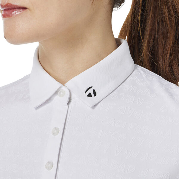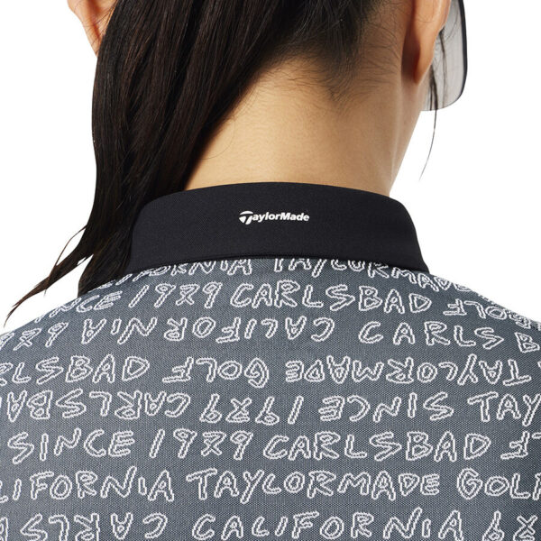 Áo polo golf nữ tay ngắn với họa tiết chữ TaylorMade được thiết kế dạng đồ họa vẽ tay và dệt nổi jacquard toàn thân, tạo nên vẻ ngoài tinh tế và mang đậm dấu ấn thương hiệu.