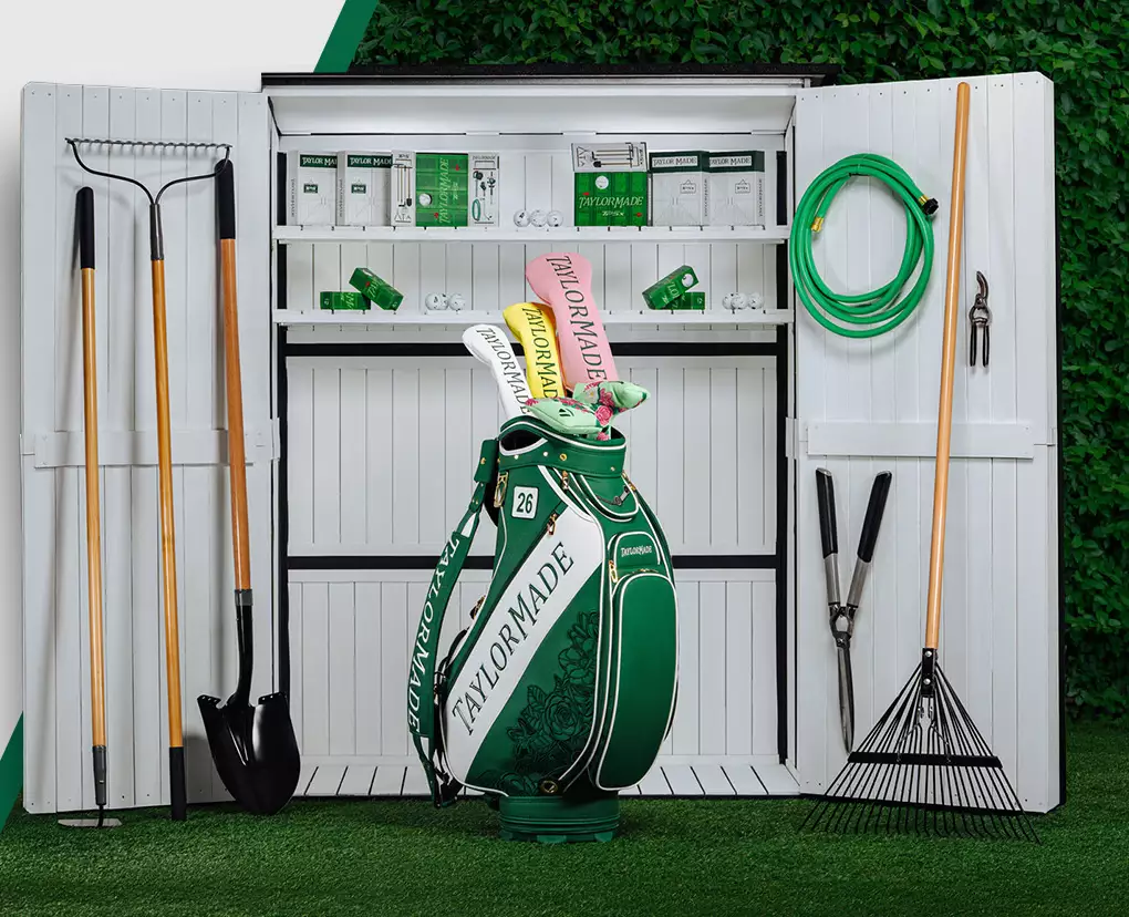 Logo TaylorMade màu xanh lá nổi bật trên nền trắng tinh khôi, gợi nhắc đến kiểu chữ mang tính biểu tượng gắn liền với giải đấu danh giá này.